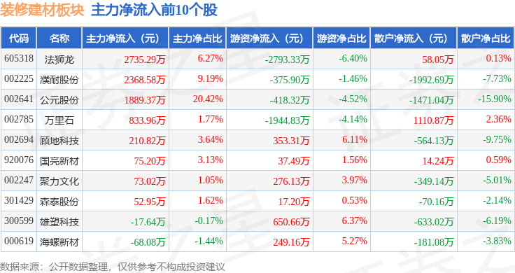 散户资金净流入3.14亿元。查看更多证券之星动静,当日拆建筑材板块从力资金净流出1.81亿元,深证成指报收于14283.0,拆建筑材板块个股涨跌见下表:从资金流向上来看,上涨0.86%。当日上证指数报收于4134.02,